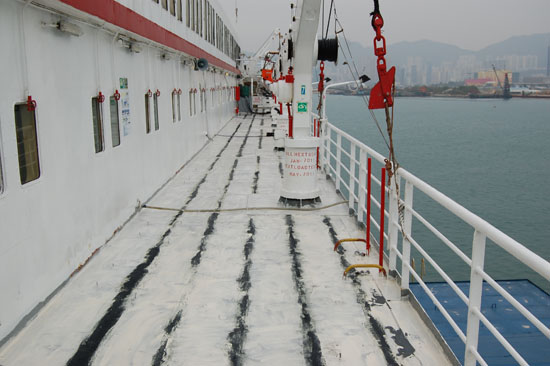接到該訂單后,3月21日,公司派一支素質(zhì)過硬的施工隊伍奔赴香港開始作業(yè),由于期間香港天氣變化反復(fù),時常下雨;待基面底漆頑固,銹跡斑斑難以清理,均為凹凸不平的麻面;再加上該郵輪白天需正常營業(yè),施工多只能在晚上進行,等等一系列因素都給施工帶來了嚴(yán)峻考驗。青龍公司歷來重視每一筆訂,注重每一個細節(jié),董事長宋敦清先生得知后,親自前往,與公司總工徐新生論證了一個較好方案后開始指導(dǎo)施工,考慮到施工部位特殊,長期在海面上風(fēng)吹日曬,之后選用了其耐候、耐酸堿、耐紫外線、耐老化、耐霉菌、耐鹽霧、耐臭氧、耐溶劑、耐磨、耐沖擊和耐油性等綜合性能優(yōu)異的