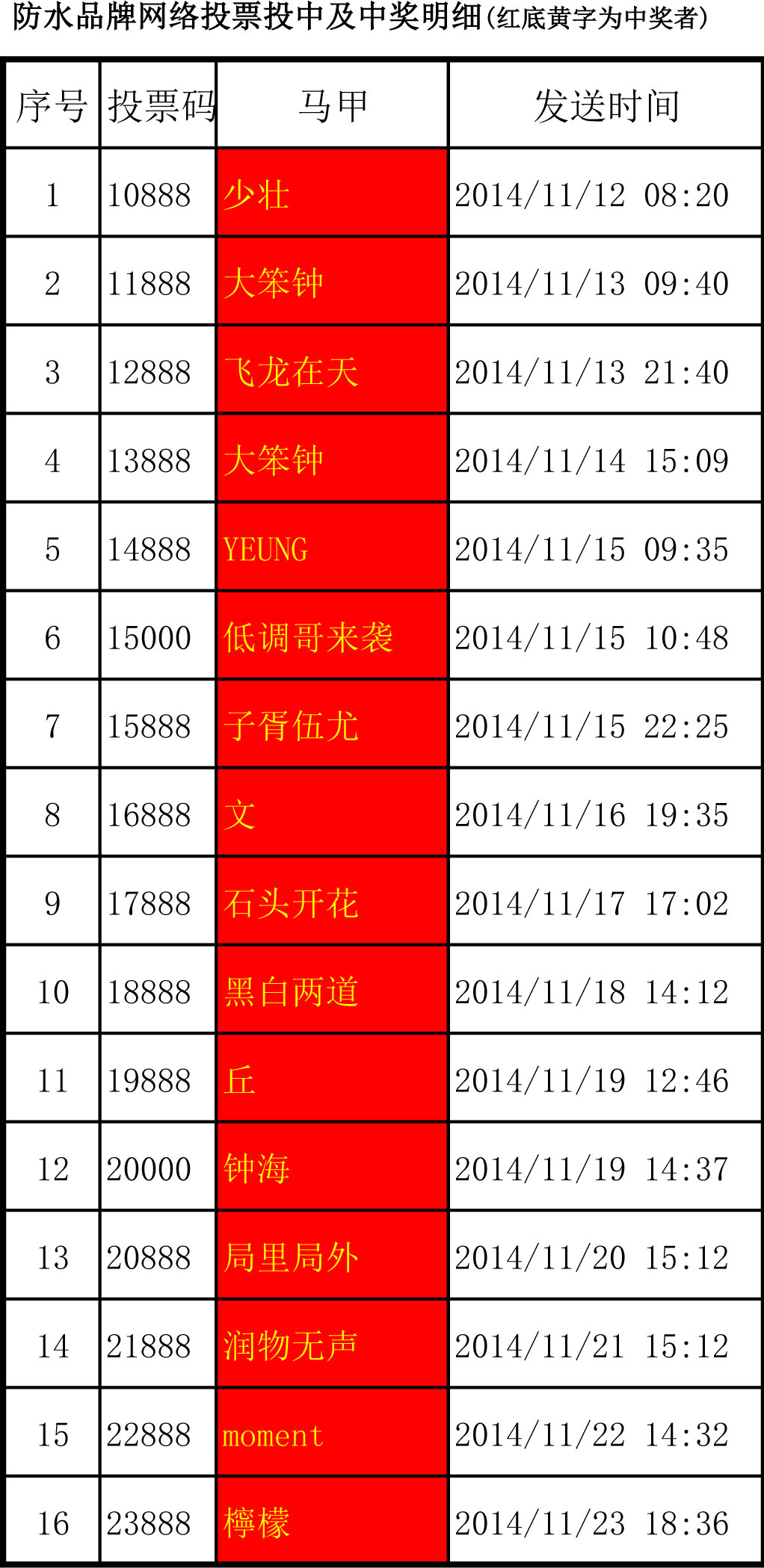 前16項(xiàng)投中及中獎(jiǎng)名單公布如下:少壯、大笨鐘、飛龍?jiān)谔臁⒋蟊跨?、YEUNG、低調(diào)哥來襲、子胥伍尤、文、石頭開花、黑白兩道、丘、鐘海、局里局外、潤物無聲、moment、檸檬。恭喜他們,也請(qǐng)大家繼續(xù)支持青龍,只為青龍投票!