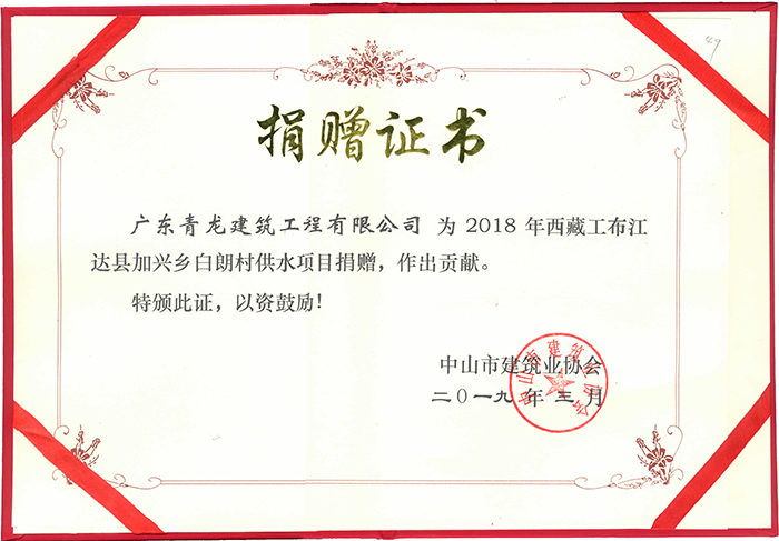 3月28日,在中山市建筑業(yè)協(xié)會第七屆二次會員大會暨工程創(chuàng)優(yōu)表彰大會上,由市住建局主導的支援西藏工布江達縣項目,由于青龍支持得力,受到市住建局和建筑業(yè)協(xié)會的高度表彰,被頒發(fā)榮譽證書。