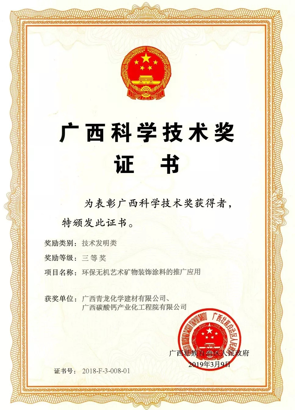 青龍公司榮獲廣西科學(xué)技術(shù)獎(jiǎng)技術(shù)發(fā)明類三等獎(jiǎng)。