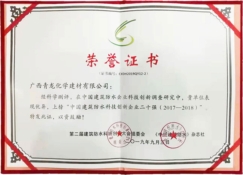 9月,第二屆建筑防水科技創(chuàng)新大會上,青龍司榮獲"中國建筑防水科技創(chuàng)新企業(yè)二十強(qiáng)",成為繼獲得首屆建筑防水科技創(chuàng)新大會"科技先鋒企業(yè)"和"科技先鋒人物"之后,青龍?jiān)佾@"科技"類殊榮,彰顯了青龍公司強(qiáng)勁的科技創(chuàng)新實(shí)力和在行業(yè)的技術(shù)地位。