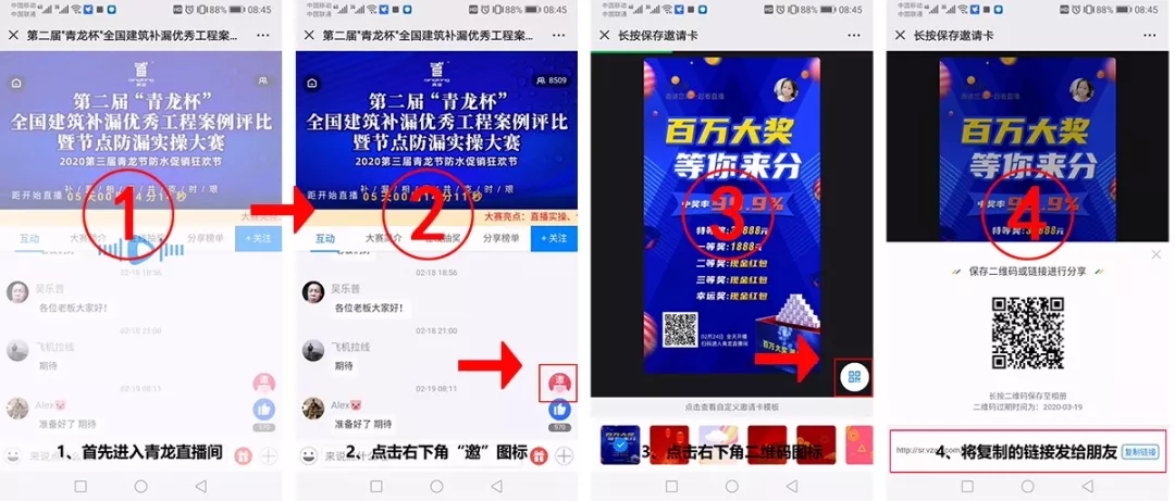 2、邀約朋友進(jìn)直播間觀看有獎(jiǎng):凡邀約朋友進(jìn)入青龍直播間觀看,直播榜單上的邀約人數(shù),即成為你的邀約榜單人數(shù),每邀約1人即可獲得1元獎(jiǎng)勵(lì)。最終獎(jiǎng)勵(lì)僅限前10名。同時(shí)為保證活動(dòng)的公正性,凡后臺(tái)發(fā)現(xiàn)數(shù)據(jù)增加異常,系統(tǒng)將自動(dòng)判定為惡意作弊,將取消其參加活動(dòng)資格。(邀約方法:青龍直播間→右下角"邀"圖標(biāo)→右下角二維碼圖標(biāo)→將復(fù)制的鏈接發(fā)給微信朋友。朋友點(diǎn)擊后,即成為你的邀約下線。)