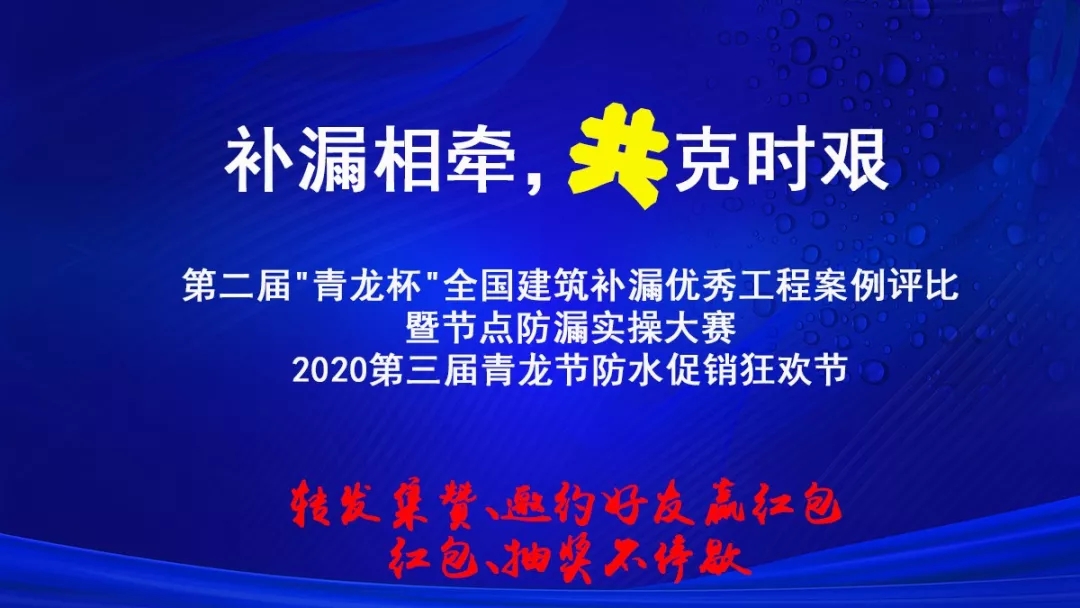 2月24日,第二屆"青龍杯"全國(guó)建筑補(bǔ)漏優(yōu)秀工程案例評(píng)比暨節(jié)點(diǎn)防漏實(shí)操大賽、2020第三屆青龍節(jié)防水促銷狂歡節(jié)將正式網(wǎng)上直播。