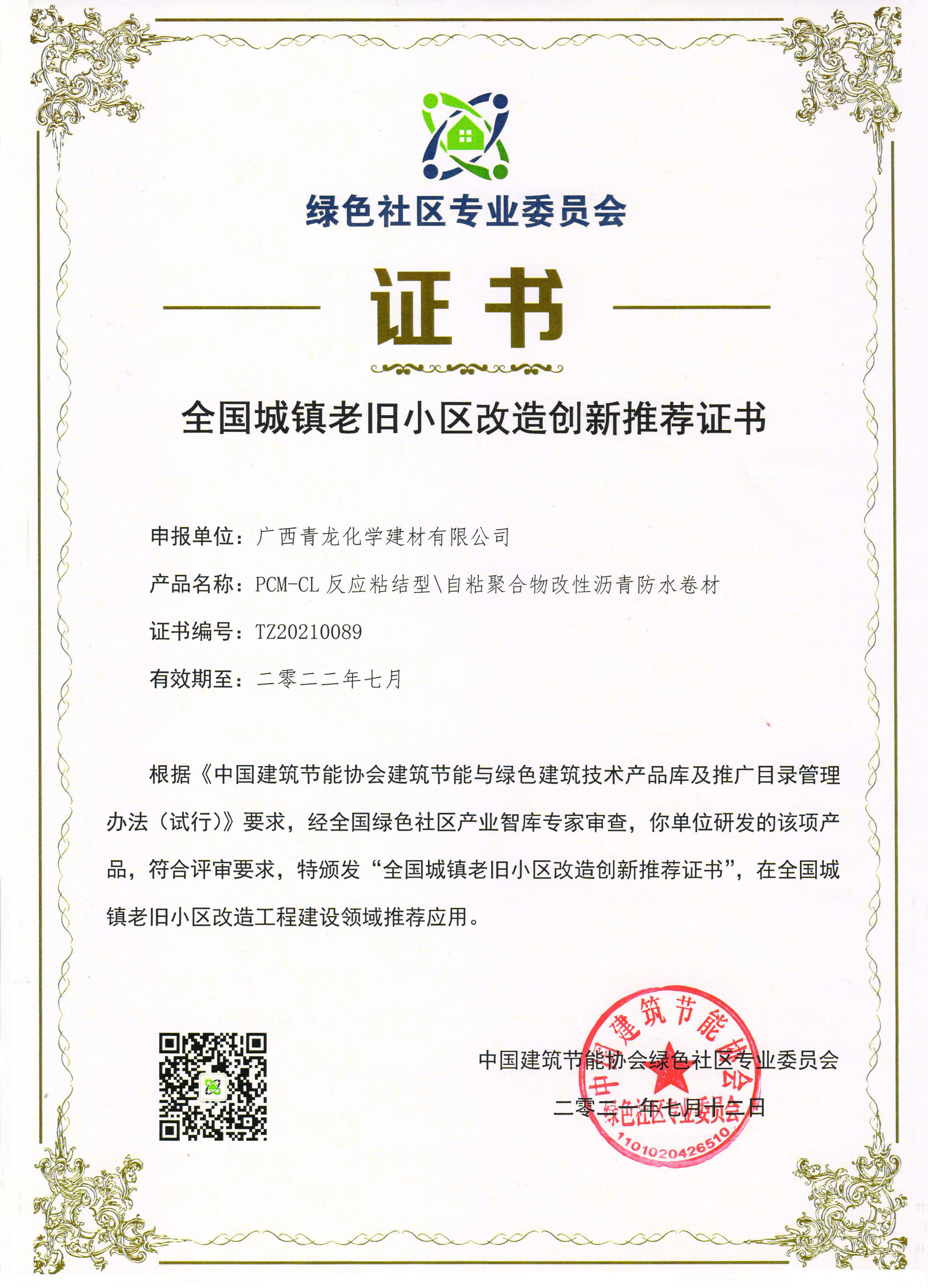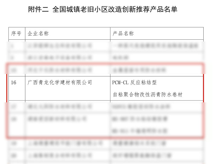 近日,由中國建筑節(jié)能協(xié)會綠色社區(qū)專業(yè)委員會主辦,全國城鎮(zhèn)老舊小區(qū)改造創(chuàng)新推薦產(chǎn)品、技術(shù)申報企業(yè)材料評審會圓滿結(jié)束,在公開、公平、公正的原則下,青龍公司自主研發(fā)生產(chǎn)的PCM-CL反應粘結(jié)型自粘聚合物改性瀝青防水卷材成功入選全國城鎮(zhèn)老舊小區(qū)改造創(chuàng)新產(chǎn)品推薦名單。