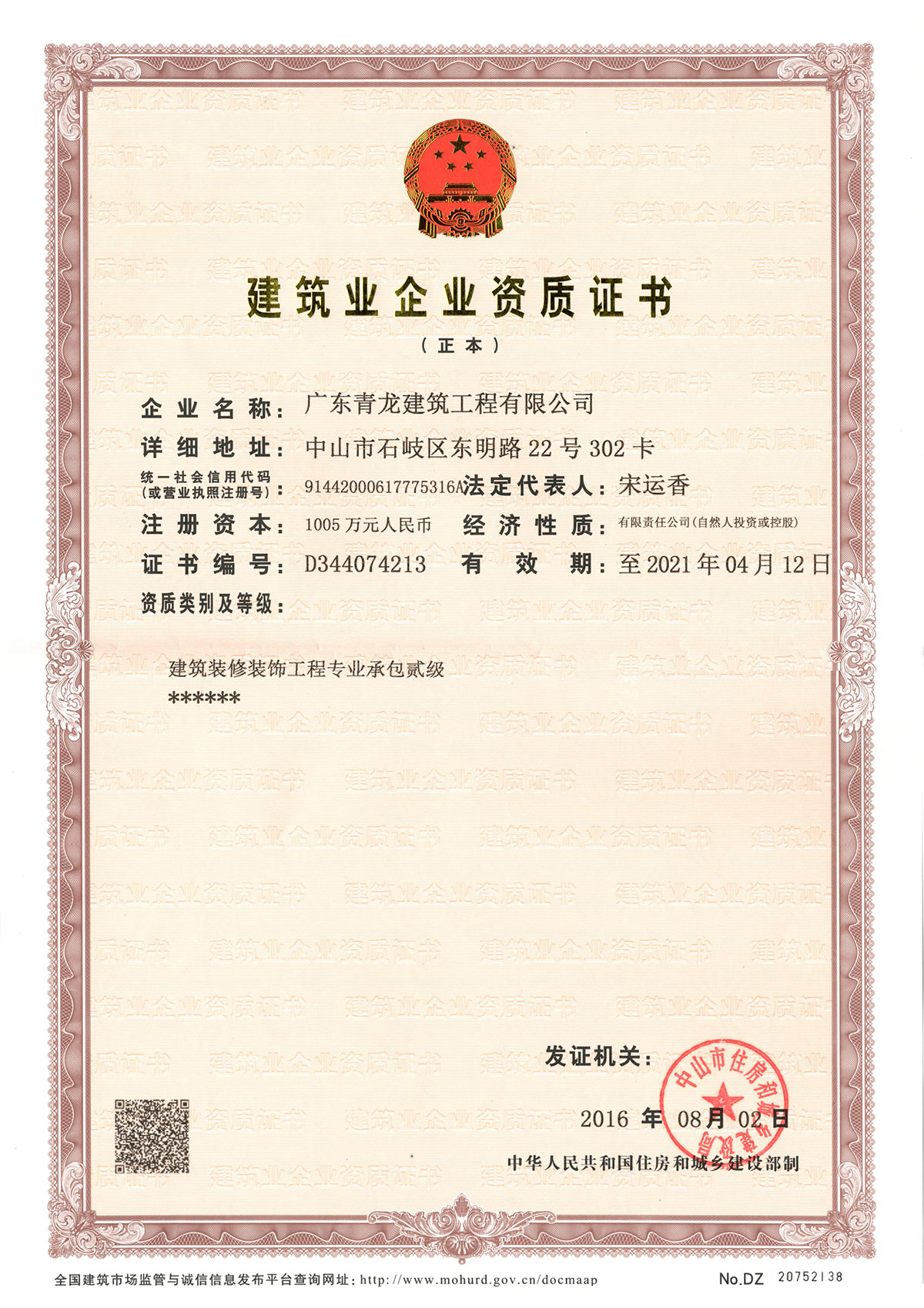 建筑裝修裝飾工程專業(yè)承包資質(zhì)對企業(yè)資產(chǎn)、企業(yè)主要人員、企業(yè)工程業(yè)績都有著非常高的要求,建筑裝修裝飾工程專業(yè)承包貳級資質(zhì)的成功取得,是對青龍實力的認(rèn)可,對于進一步擴大企業(yè)的品牌影響力、提升企業(yè)競爭力有著重大意義。