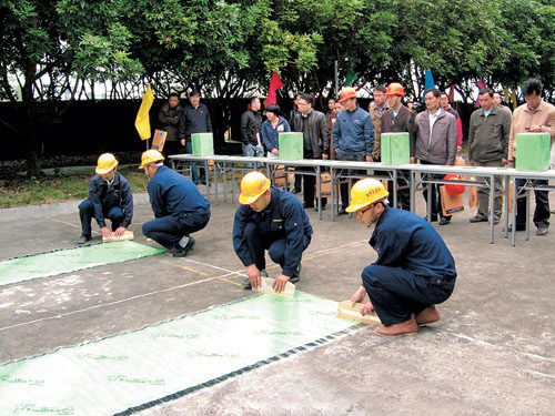 防水材料與施工工藝示范觀摩會。當日上午9時許,觀摩會現(xiàn)場工作人員展示防水施工現(xiàn)象,吸引了全場300多名參觀人員的眼球。主辦方通過展示各種防水材料在陰角、陽角、及管根邊等易滲、漏水的細部節(jié)點規(guī)范化施工工藝,推行標準化施工工藝以及簡單可靠的防水驗收方法,為在場的參觀人員上了生動的一課。