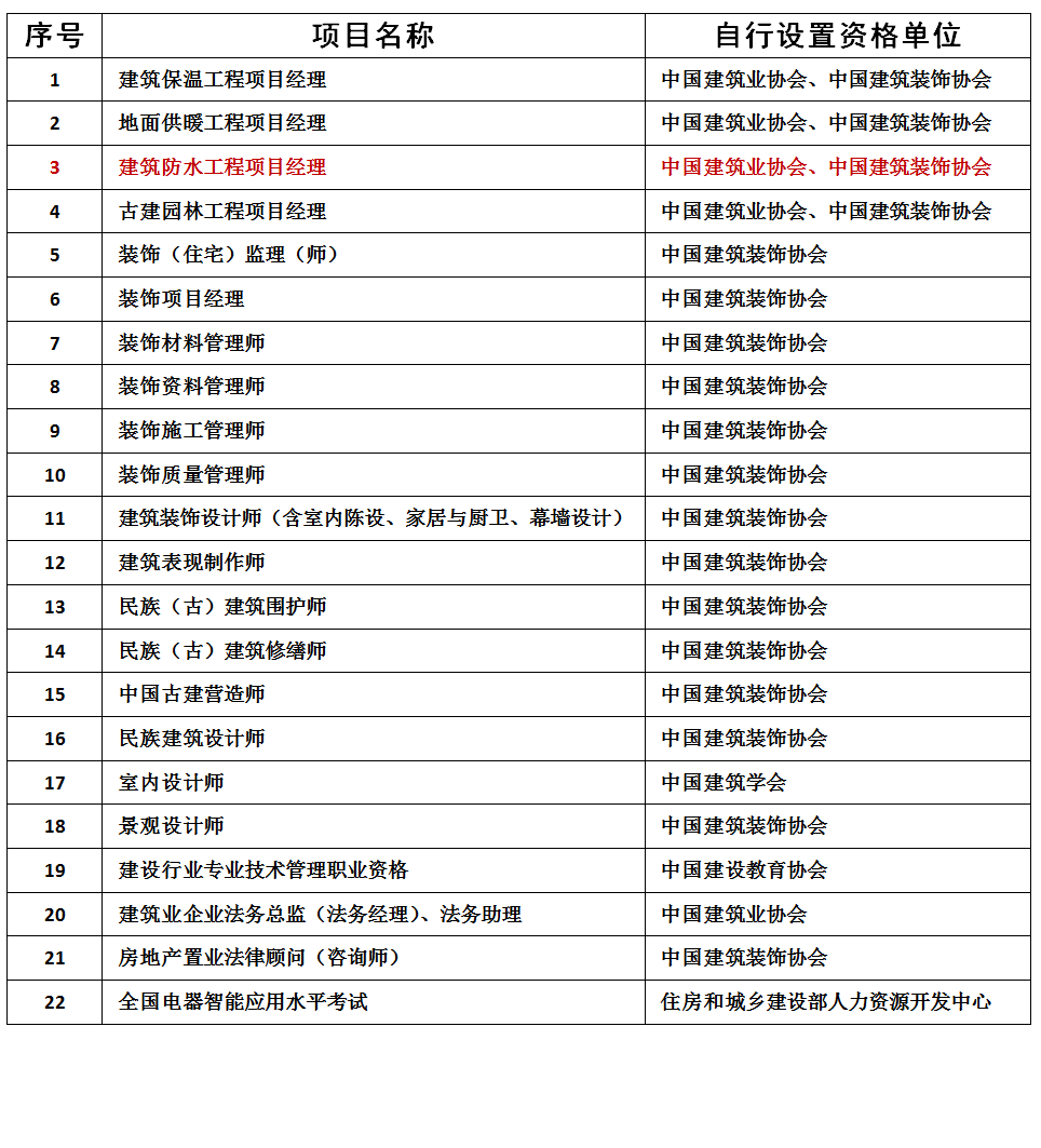 建筑防水工程項目經(jīng)理等22項職業(yè)資格的評價、認(rèn)定、發(fā)證等工作被叫停,這是住房城鄉(xiāng)建設(shè)部辦公廳近日下發(fā)的通知明確的。