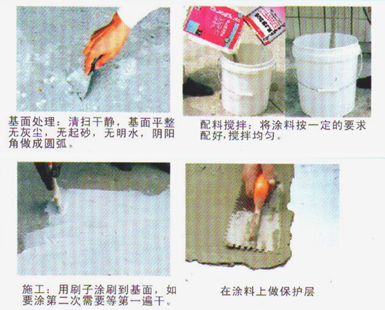 1.適用于屋面、地下工程隧道、泳池、食用水池及室內(nèi)工程基面,如:剛凝固的水泥砂漿找平層上,地下室剛拆模的基面上,或基面淋雨潮濕(無(wú)明水)均可直接施工。