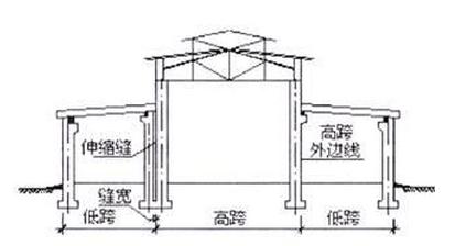 高低聯(lián)跨的建筑物應以高跨結(jié)構(gòu)外邊線為界分別計算建筑面積;其高低跨內(nèi)部連通時,其變形縫應計算在低跨部分的面積內(nèi)。(圖4)