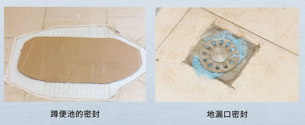 ②拿開(kāi)地漏,用塑料袋堵住地漏,并用膠帶固定密封,直至保證水漏不下去為止,(必須先堵好地漏,以免材料凝膠后堵塞下水道)。如果大便器是蹲式的,需用紙板或泡沫板裁剪成與蹲便器大小相近的形狀并用膠帶固定密封,以防止?jié){液流入大便池后凝膠造成下水道堵塞。廚房衛(wèi)生間門口位置如果低于2厘米高的,請(qǐng)用泡沫板在門口做一道高3厘米的堤壩,防止材料流出。