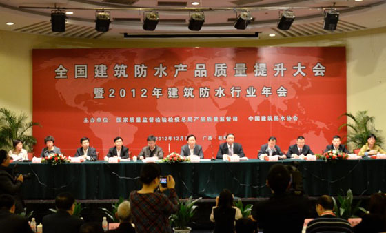 2012年12月7日,全國建筑防水產(chǎn)品質(zhì)量提升大會在桂林召開。此次會議由國家質(zhì)量監(jiān)督檢驗檢疫總局、中國建筑防水協(xié)會主辦,來自25個?。ㄗ灾螀^(qū)、直轄市)質(zhì)監(jiān)部門和生產(chǎn)許可管理部門的負責人,以及全國建筑防水行業(yè)骨干企業(yè)的負責人,共計450多人出席會議。